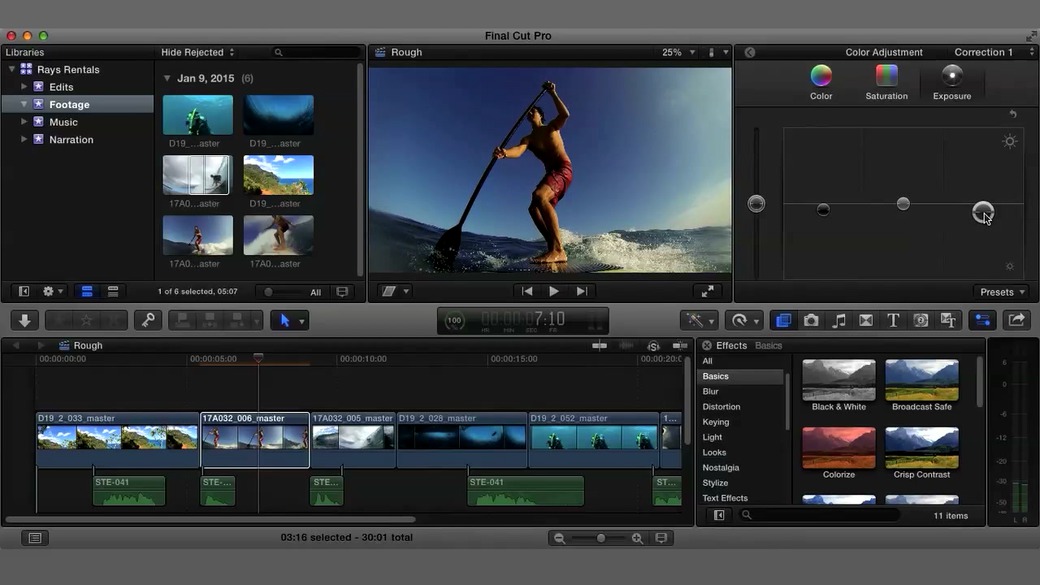 Ich arbeite mit Apple’s Final Cut Pro X, einer „State of the art“ Schnittsoftware, die mir fast grenzenlose Freiheiten in der Nachbearbeitung von Videoproduktionen gibt.